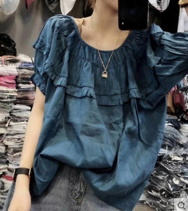 ップス チュニック ブラウス おしゃれ シンプル ゆったり 白 ブルー フリル 無地 ラウンドネック 半袖 夏 大きいサイズ 大人可愛い 10代 20代 30代 お出かけ デート お呼ばれ レトロ キュート 上品 トレンド 人気