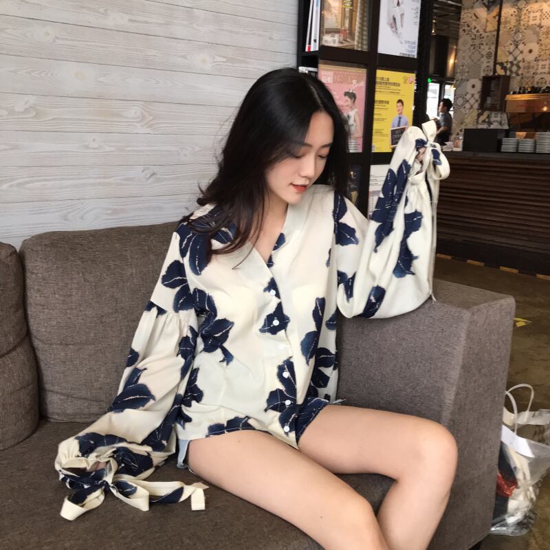 ●ブルーの花柄が白地にとても映える爽やかで綺麗なシフォンシャツです。袖のリボンがとてもキュート!