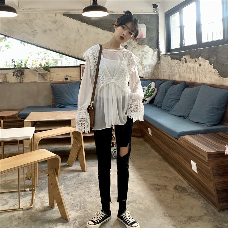 レースシフォンシャツ トップス フリル ラウンドネック シースルー 透け 長袖 背中見せ セクシー ボリューム袖 セットアップ 白 黒 単色 キャミ付き ゆったり 体型カバー フェミニン デート 春夏 レディース