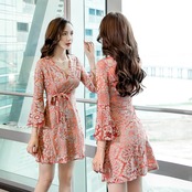 ワンピース 総レース ミニ丈 深Vネック 長袖 ベルスリーブ 花柄 Xライン カシュクール ボディフィット エレガント 上品 春夏 お呼ばれ オレンジ 緑