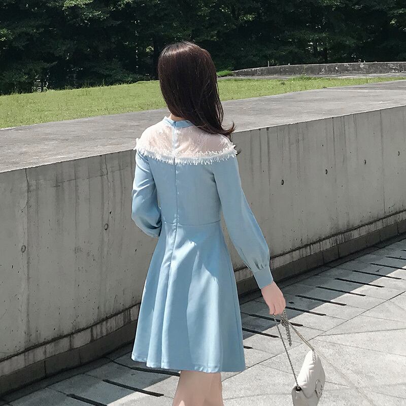 ワンピース ミニ丈 ラウンドネック 長袖 バルーンスリーブ 無地 Xライン シースルーデコルテ お嬢様 春夏 デート ウエストマーク スカイブルー