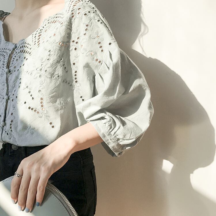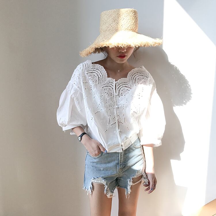ガーリーレースシャツ トップス 春夏 七分袖 ゆったり ザックリ 体型カバー 鎖骨見せ 前ボタン バルーンスリーブ ドルマンスリーブ シンプル コットン レディース お買い物 デート