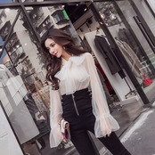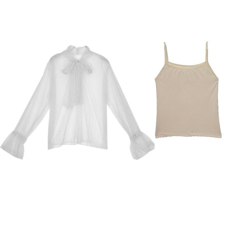 ●ヒラヒラとクリオネのようなレースが綺麗なシースルーシャツです。首元の大きなリボンがキュート!キャミ付きのお得な2点セット!