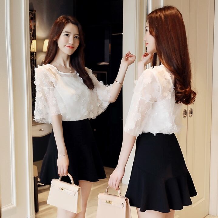 カットソー ラウンドネック 半袖 フレア袖 花柄 総レース フォーマル 春夏 お出かけ おしゃれ 透け感 シースルー アプリコット ホワイト
