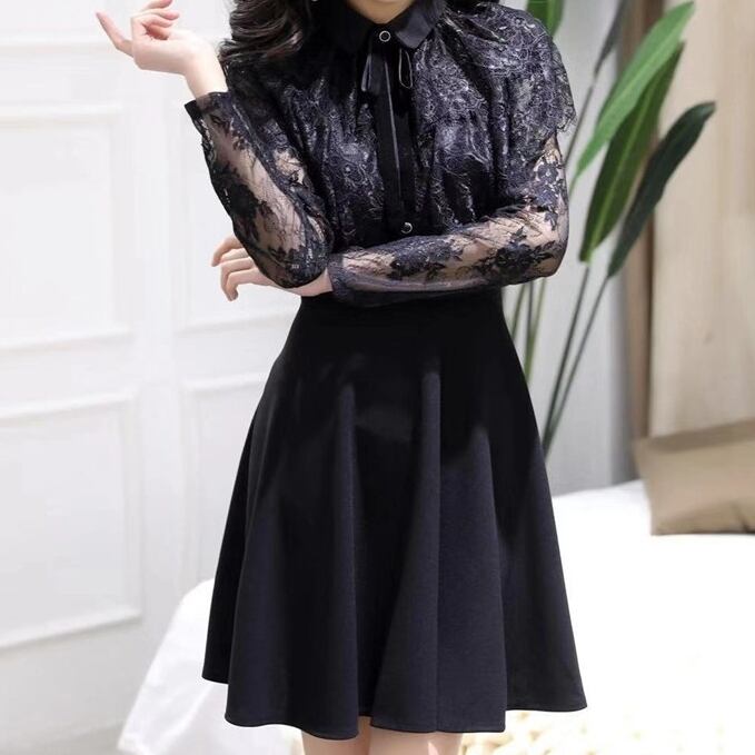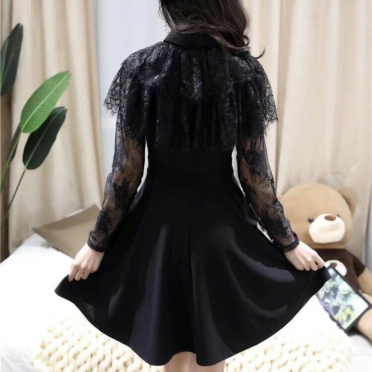 ワンピース 総レース ミニ丈 襟つき 長袖 花柄 Xライン 透け リボン シック 春秋 お出かけ フェイクレイヤード ポンチョ 黒