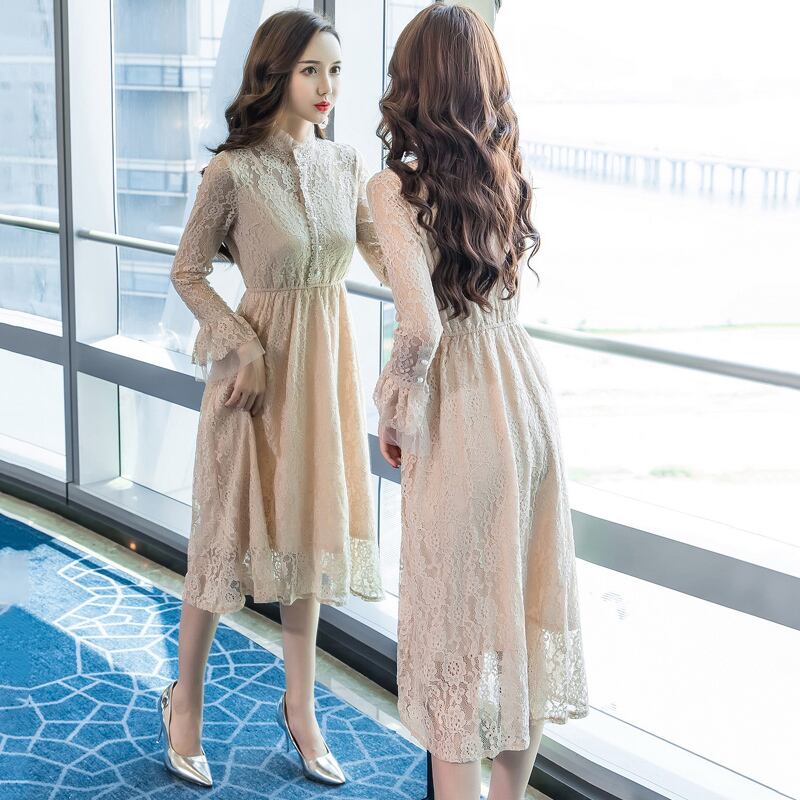 マキシワンピース 総レース ラウンドフリルネック 長袖 ベルスリーブ 花柄 Aライン 透け感 お嬢様 春夏 お呼ばれ フロントボタン アプリコット 黒