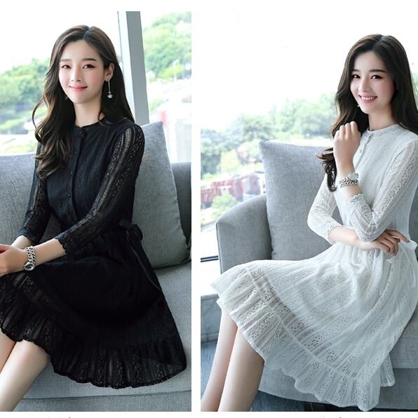 ワンピース 総レース ミニ丈 ラウンドネック 七分袖 Xライン ボディフィット 裾レース 透け エレガント 春秋 デート ウエストマー ク リボン 白 黒