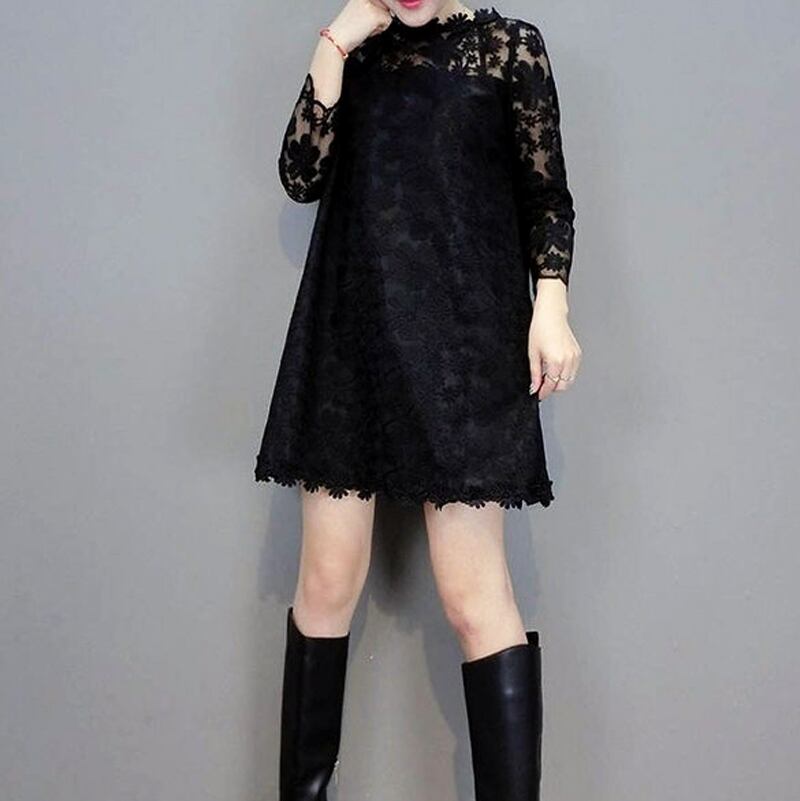 ワンピース 総レース ミニ丈 ラウンドネック 七分袖 裾スカラップ 花柄 Iライン 裾レース 透け カジュアル 春秋 デート 白 黒