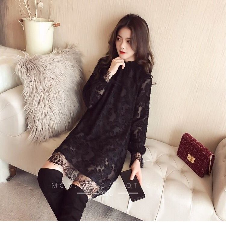 ワンピース 総レース ミニ丈 フリル スタンドネック 長袖 ストラップカフス Iライン 体型カバー キュート カジュアル 春秋 デート 黒 白