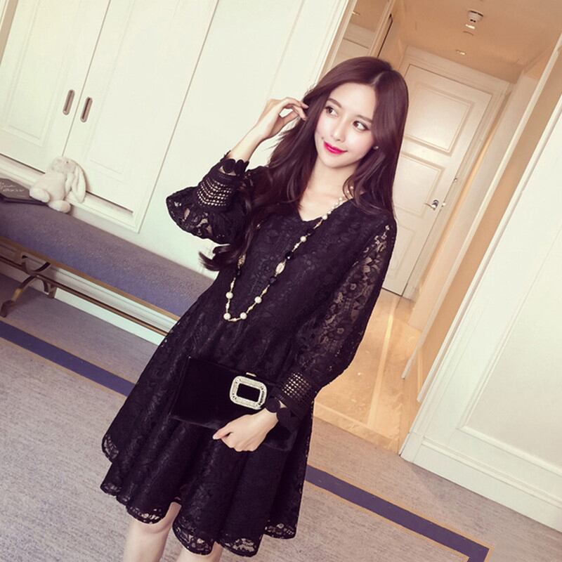ワンピース 総レース ミニ丈 Vネック 七分袖 バルーン ストラップカフス 個性的 Xライン 大きいサイズ 透フレアー フォーマル 春秋 二次会 赤 黒 白