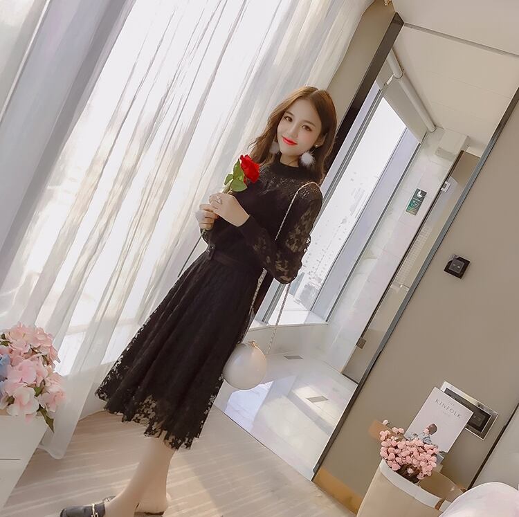 ワンピース レース ひざ丈 ハイネック 長袖 ニットカフス 花柄 Iライン きれいめ 春秋 お呼ばれ フレア ウエストマークベルト 黒 アプリコット