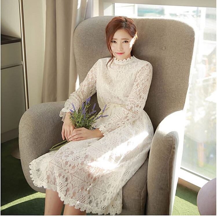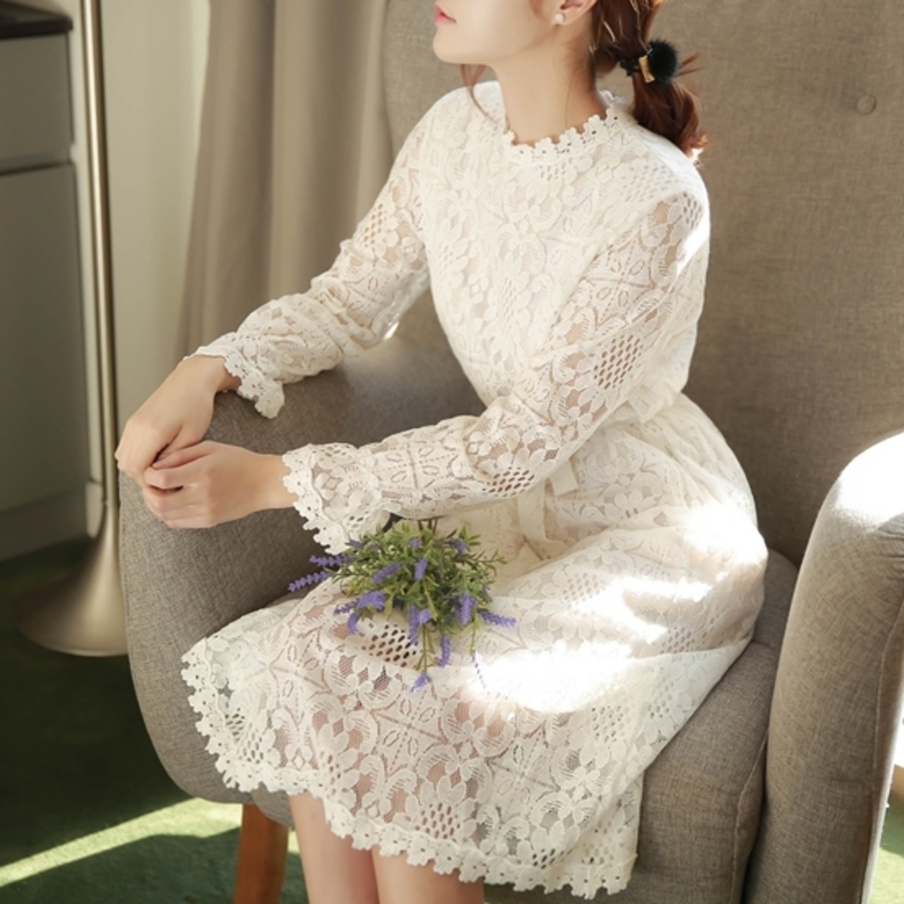 ワンピース 総レース マキシ丈 スタンドレースネック 長袖 スカラップスリーブ 花柄 Iライン 透け感 ウエストリボン 清楚 春秋 デート
