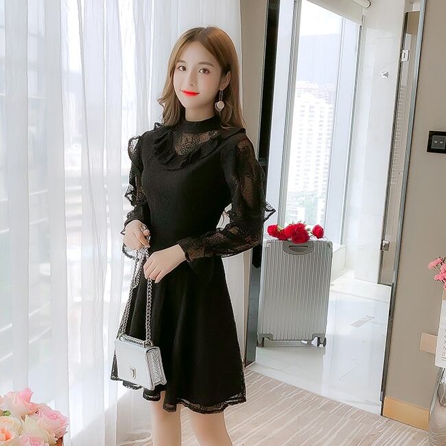 ワンピースドレス 総レース ミニ丈 ラウンドネック 長袖 フリル袖 ストラップカフス 花柄 Xライン 透け感 フレアキュート 春秋 お呼ばれ