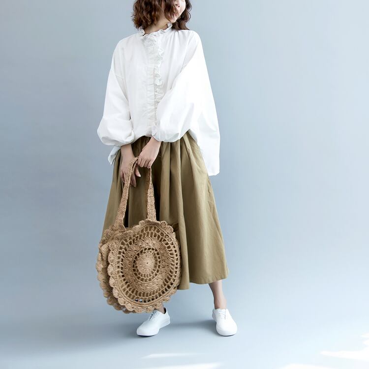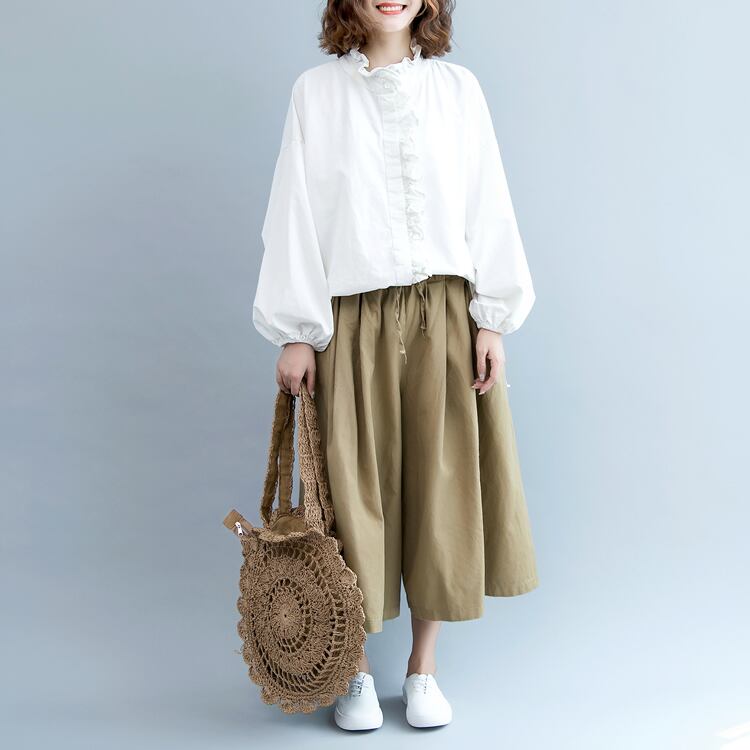 フリルデザインの襟元とランタンスリーブがお洒落なホワイトシャツ★
