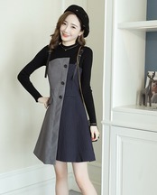バイカラー 切り替え ワンピース ストラップワンピース 膝丈 ミディアム スカート きれいめ フレアスカート 秋冬 c0021-2