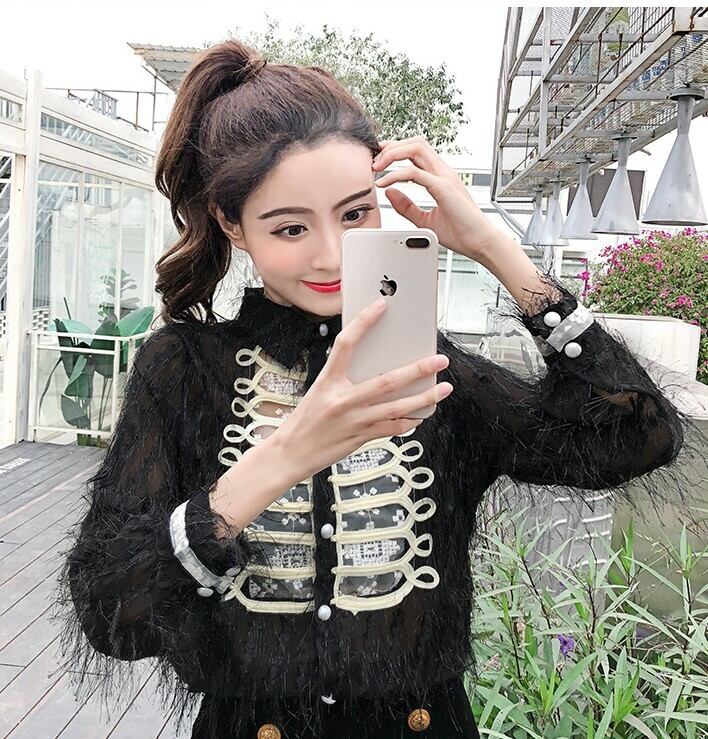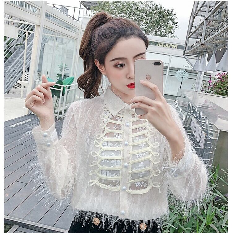 ●ほつれ加工がオシャレな襟付きシャツです。胸元のシースルーがでセクシーで存在感のあるデザイン!