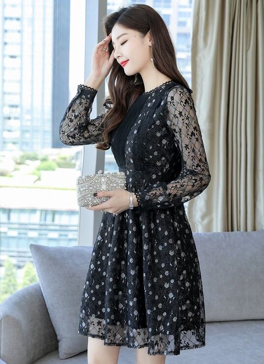 切替ワンピース プリーツ レース ミディアム丈 ワンピース 長袖 膝丈 きれいめ パーティー ドレス 可愛い c0042