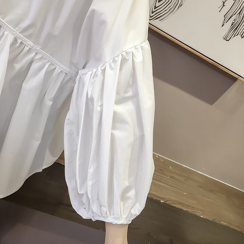 トップス 綿 リボンネック 七分袖 ボリューム袖 ランタンスリーブ 無地 ゆったり フレア ナチュラル 春夏 シャーリングトップ 白