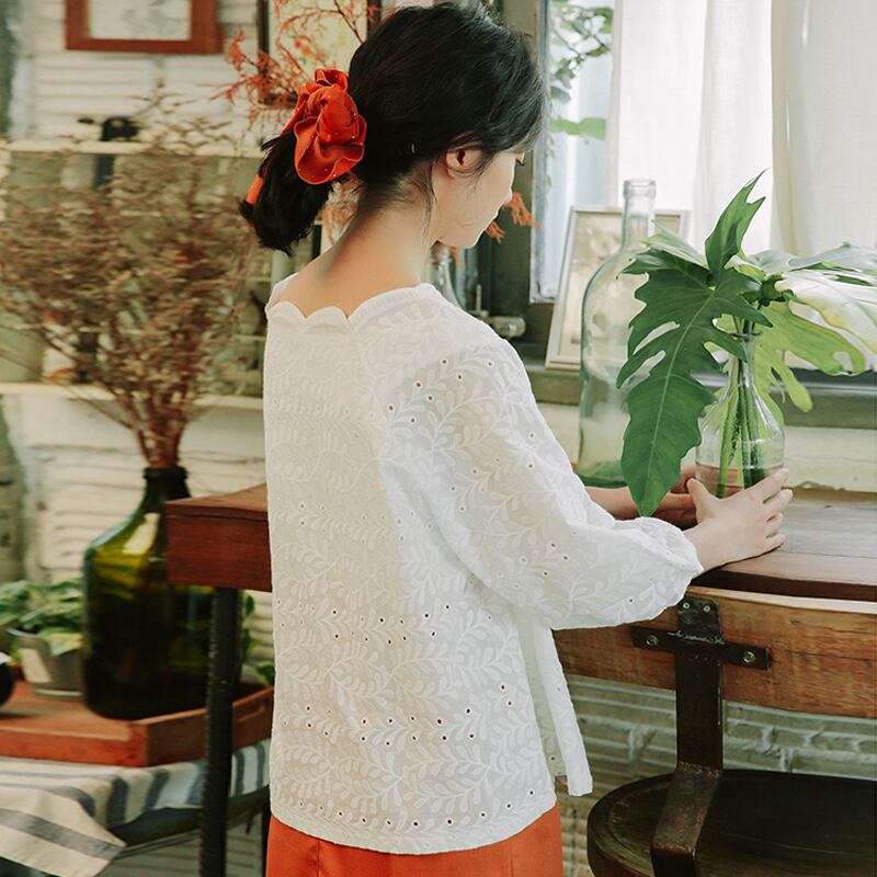 カットソー プルオーバー コットン スカラップネック 七分袖 ウィンドカフス 無地 ゆったり レース刺繍 ナチュラル 春夏 デート 白