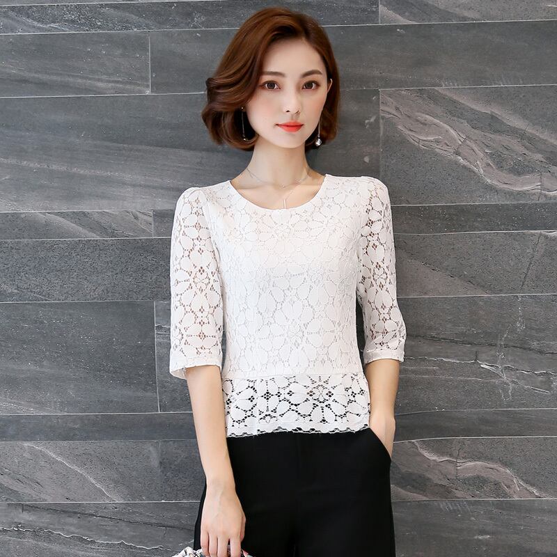カットソー トップス 総レース ラウンドネック 七分袖 無地 花柄 タイトフィット 切替 ぺプラム シンプル きれいめ 春夏 黒 白 黄