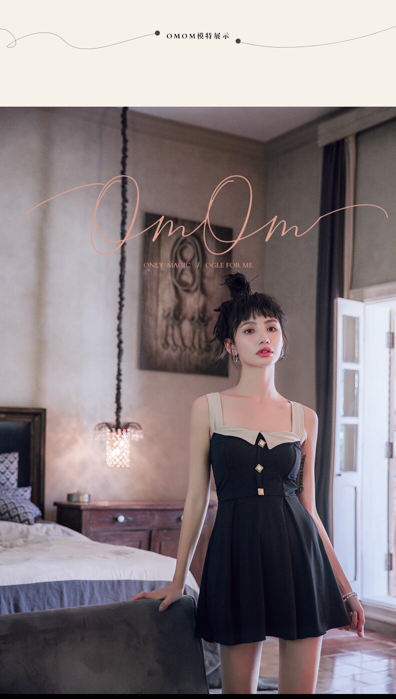 ノースリーブワンピース水着 ミニスカート フレアスカート 上品 ボタン付 きひし形 肩出し パーティードレス ショートパンツ ボクサーパンツ 2セット ブラック ベージュ 夏 海 プール リゾート レディース