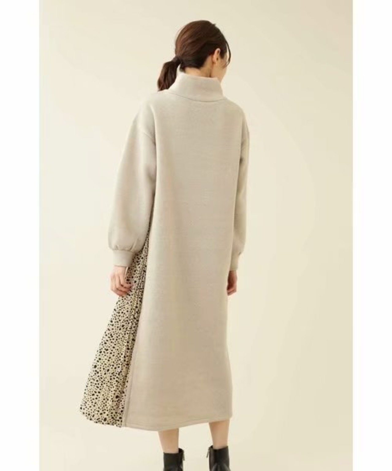 ミディアム丈ワンピース ロングワンピース ハイネック 長袖 スリット プリーツ 軽量 ゆったり ざっくり 体型カバー マタニティー Aライン シンプル 大人可愛い 重ね着 フリース 暖か オシャレ 無地 シック お出かけ デート ショッピング 普段遣い 秋 冬 レディース 女性