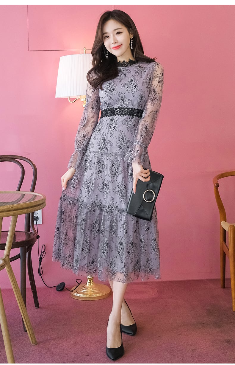 パーティードレス ミディアム丈ドレス ミディアム丈ワンピース 総レース ハイウエスト 花柄 シースルー 透け感 肌見せ エレガント セクシー 美ライン フェアリー 上品 二次会 お呼ばれ 結婚式 大人可愛い フリル 背中ファスナー 長袖 春 夏 秋 冬 レディース 女性