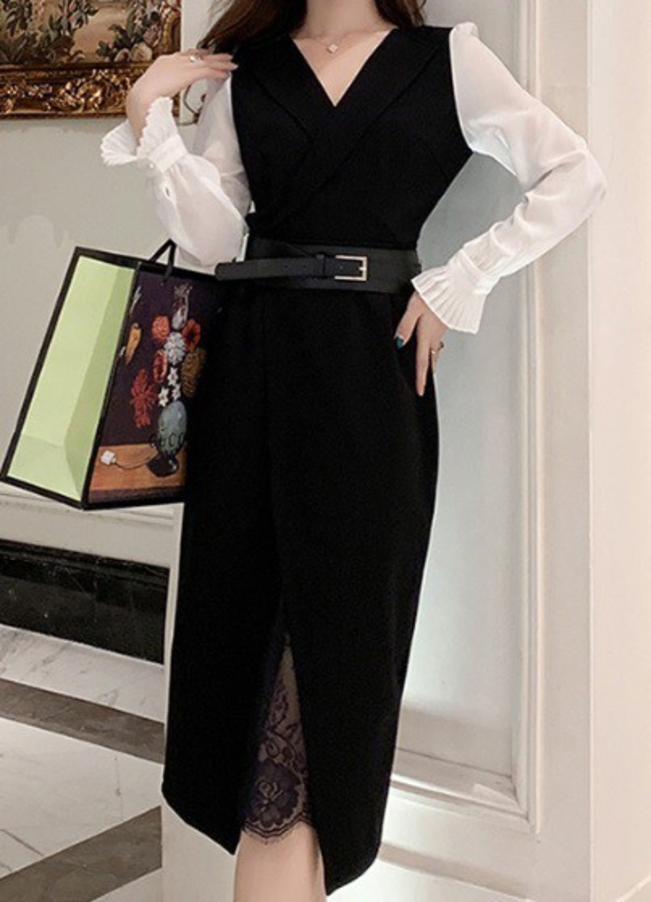 ドッキングワンピース レース Vネック ミモレ丈 長袖 フリル袖 大きいサイズ ゆったり Aライン スリット 切り替え ベルト 大人可愛い 春夏 トレンド 黒 白 10代 20代 30代 OL お出かけ デート お呼ばれ パーティー ディナー 上品 セクシー