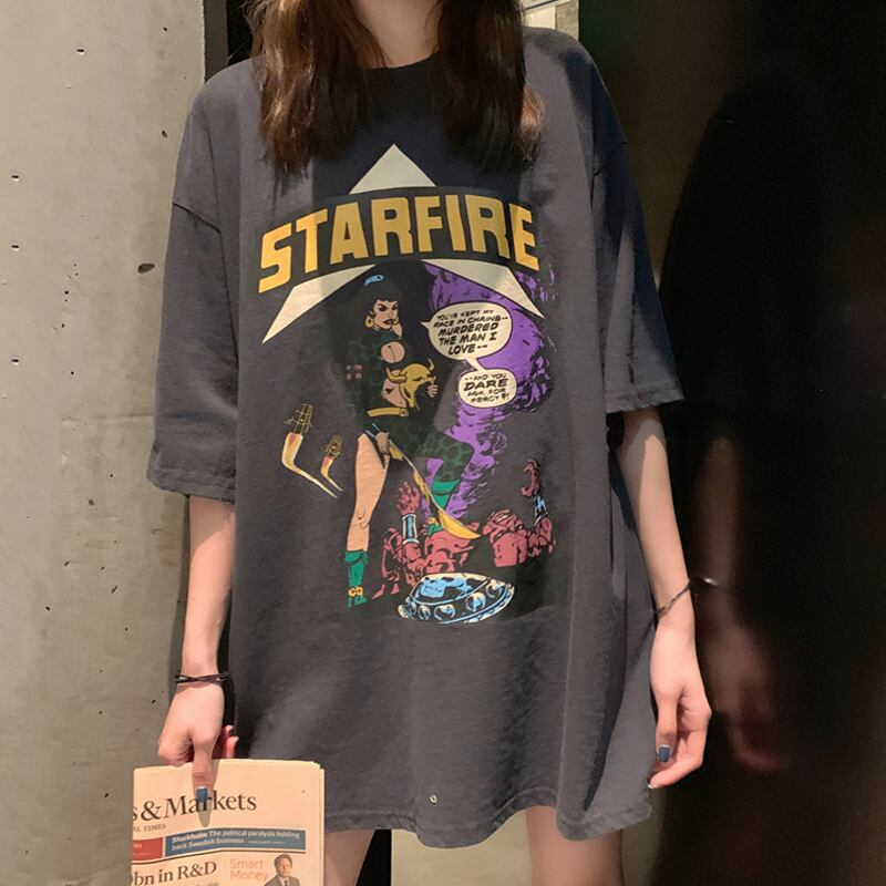 Tシャツ トップス 半袖 五分袖 大きめ ゆったり ヒップ丈 アメカ ジカジュアル ストリート シンプル フロントプリント ラウンドネック 夏 ルームウエア お出かけ ショッピング レディース 女性