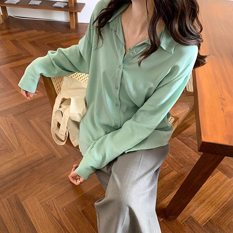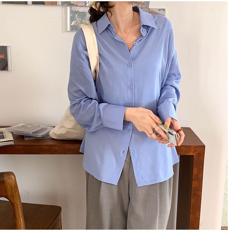 シャツ ブラウス 長袖 フロントボタン 襟付き シンプル きれいめ 無地 ゆったり レトロ 薄手 春 トップス オフィス お出かけ ショッピング カラー豊富 レディース 女性