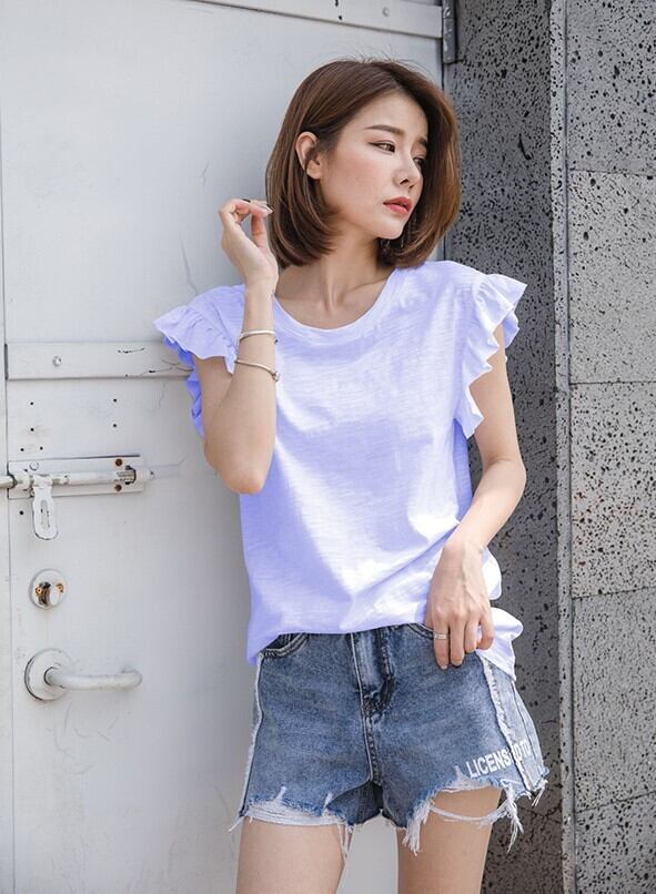 Tシャツ 袖フリル 半袖 トップス コットン 薄手 無地 シンプル 大人可愛い オシャレ 夏 お出かけ デート ショッピング レディース 女性