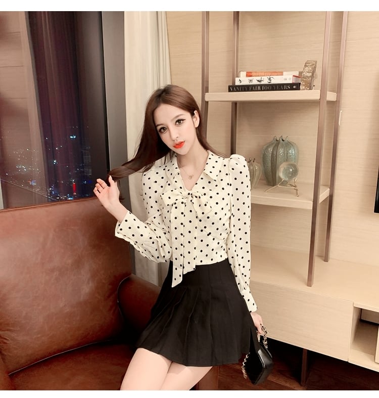 シャツ ブラウス 長袖 ドット柄 水玉 ショート丈 へそ出し 肌見せ ネクタイリボン Vネック 襟付き 春 レトロ トップス お出かけ デート ショッピング レディース 女性