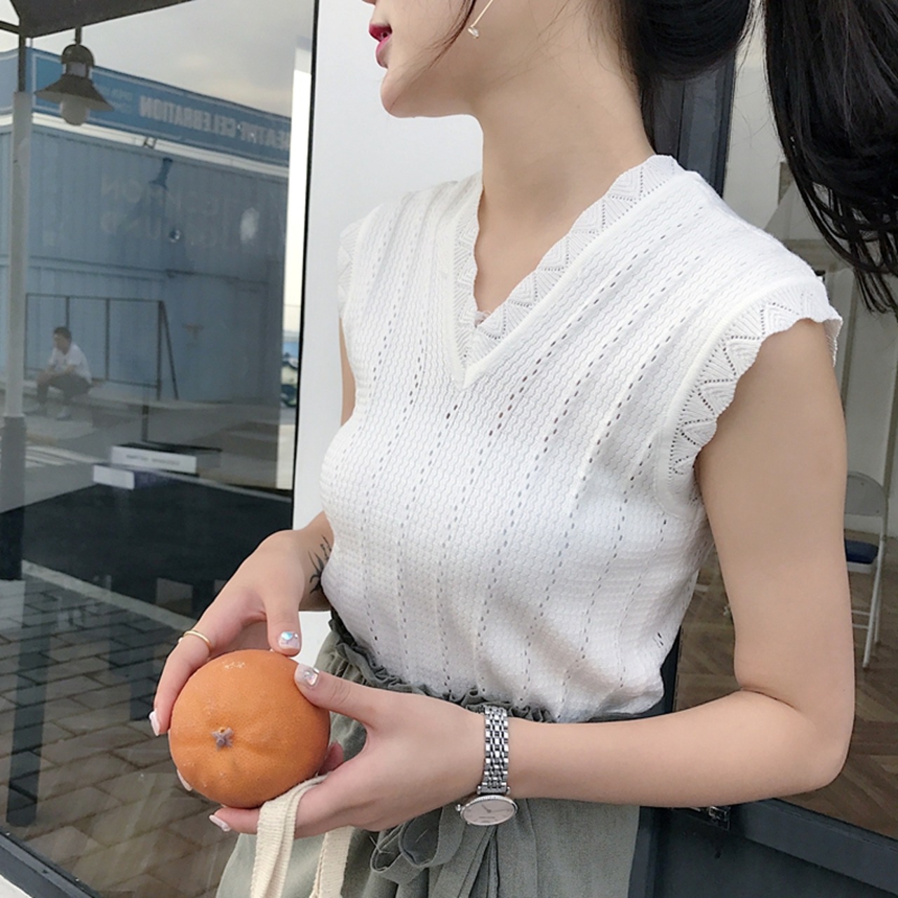 ノースリーブシャツ レースニット カットソー 鎖骨見せ Vネック シンプル 無地 レトロ 上品 ガーリー 大人可愛い 夏 トップス お出かけ デート ショッピング レディース 女性