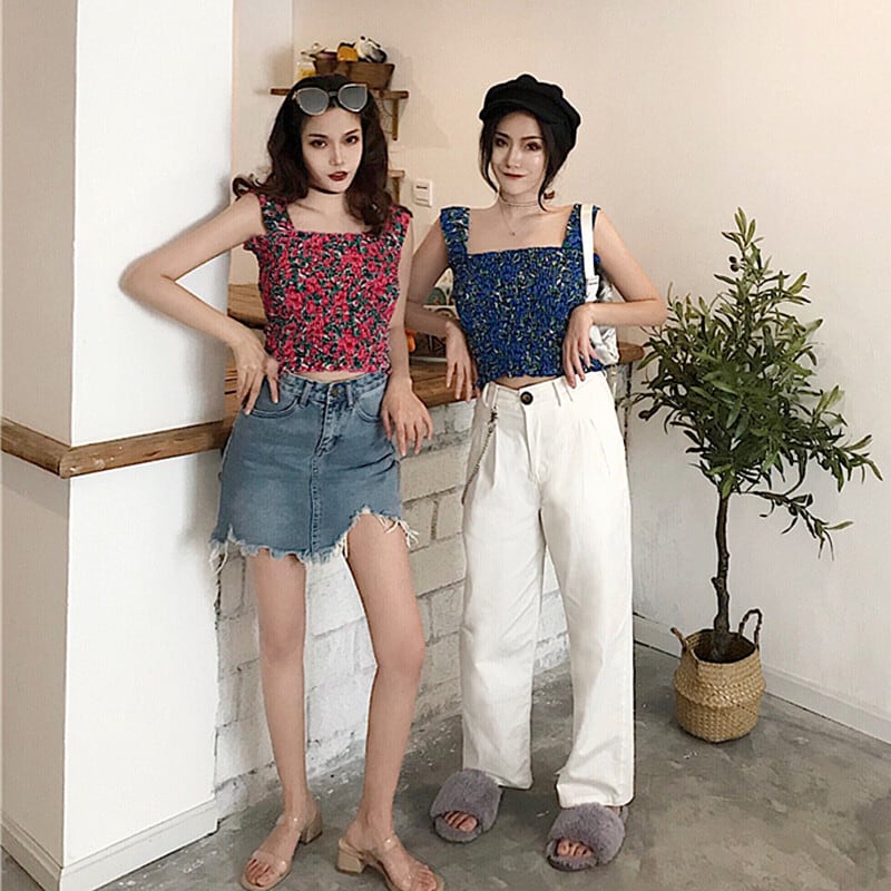 ノースリーブ タンクトップ キャミソール ショート丈 花柄 レトロ アジアン 鎖骨見せ へそ出し ストレッチ 伸縮性 スリム 夏 トップス レディース 女性