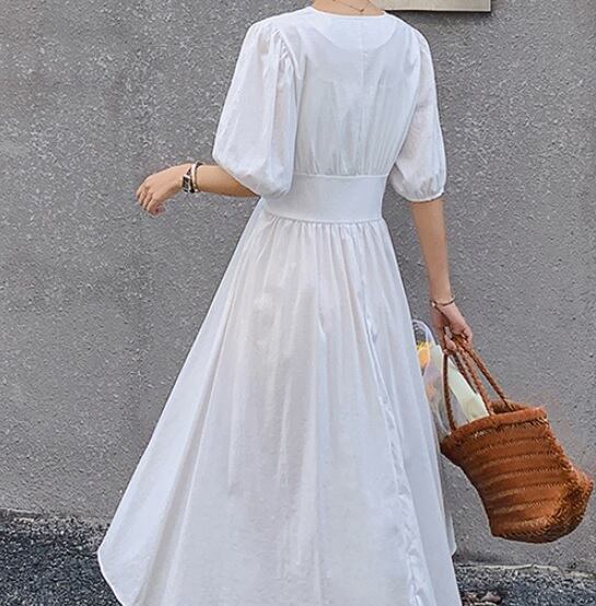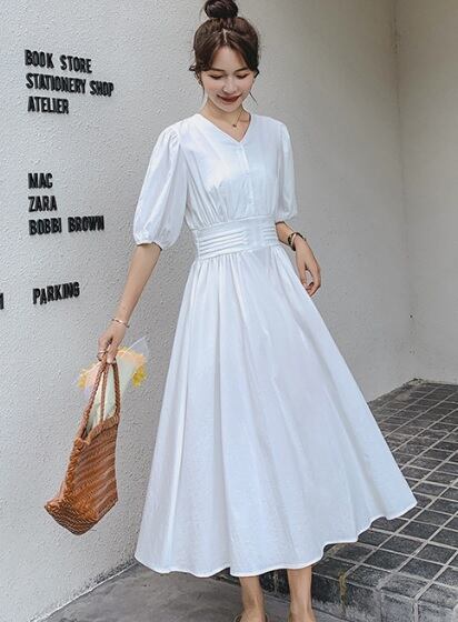 フレアワンピース シャツワンピース シフォン Vネック ミモレ丈 七分袖 バルーン袖 大きいサイズ ゆったり Aライン 大人可愛い 春夏 トレンド 白 10代 20代 30代 お出かけ デート カジュアル 清楚 フェミニン キュート