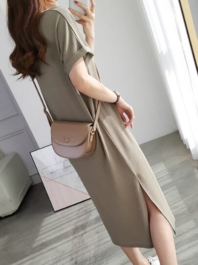 ワンピース Vネック ミモレ丈 半袖 ゆったり スリット Hライン 大人可愛い 春夏 無地 トレンド 黒 イエロー グリーン ブルー 10代 20代 30代 お出かけ デート カジュアル シンプル