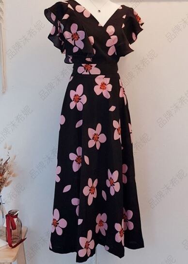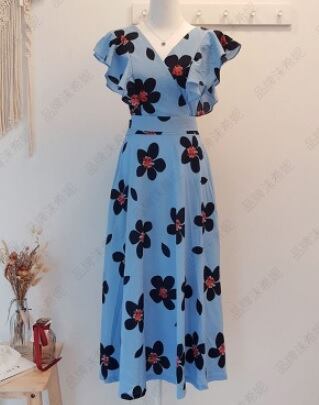ワンピース Vネック ミモレ丈 半袖 ゆったり Aライン フレア ウェストリボン 大人可愛い 春夏 花柄 トレンド 黒 ブルー 10代 20代 30代 お出かけ デート お呼ばれ きれいめ 上品 フェミニン