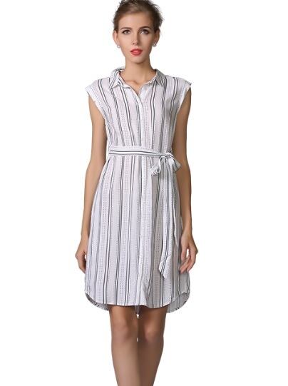 シャツワンピース コットン 襟付き Vネック ひざ丈 ノースリーブ 大きいサイズ ゆったり Aライン ウェストリボン 大人可愛い 春夏 ストライプ柄 トレンド 白 10代 20代 30代 お出かけ デート カジュアル きれいめ 上品 清楚