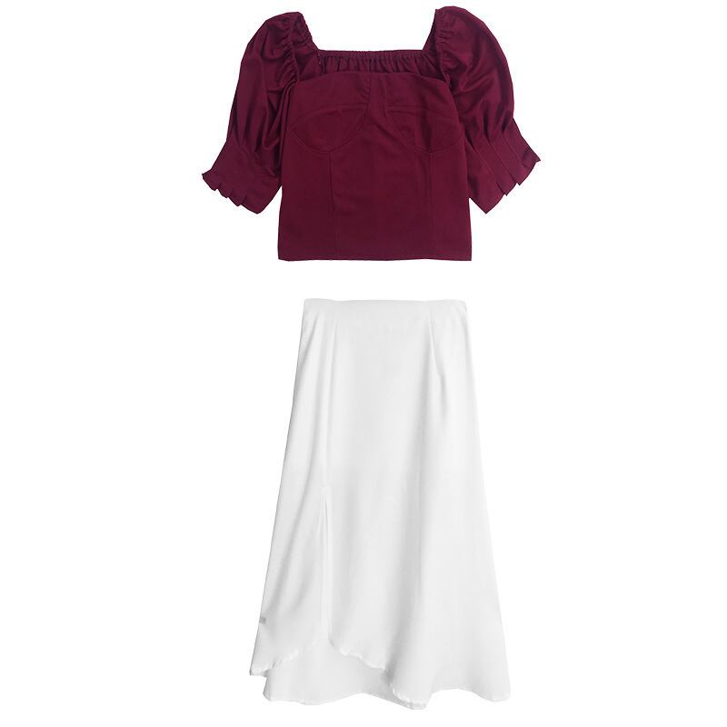 2ピース セット トップス ボトムス 半袖 スカート ミディアム丈 パフスリーブ スクエアネック 鎖骨見せ シンプル 無地 ベルベット シック 不規則 スリット セクシー 大人可愛い ハイウエスト 春 夏 お出かけ デート ショッピング レディース 女性
