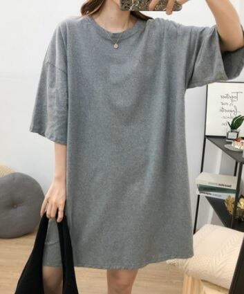 ミニワンピース コットン ラウンドネック ショート丈 五分袖 ゆったり 大人可愛い 春夏 トレンド 黒 グレー レッド 10代 20代 30代 お出かけ デート カジュアル シンプル