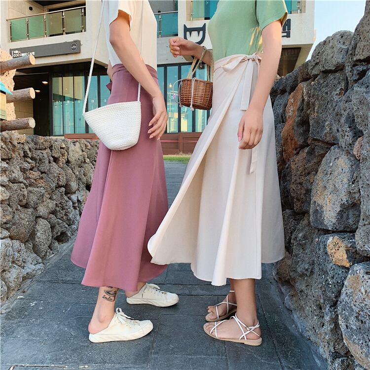 ラップスカート 巻きスカート ミディアム丈 Aライン フレア ウエストリボン シンプル 無地 カラー豊富 オシャレ シフォン ボトムス 春 夏 涼し気 人気 お出かけ ショッピング レディース 女性