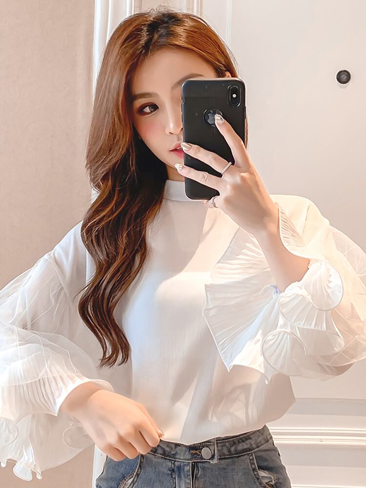 ●袖のデザインにこだわったシフォンシャツです。ひらひらとした薄い生地で、フェアリー感漂う魅力的な一品!一枚でゴージャスな印象です。