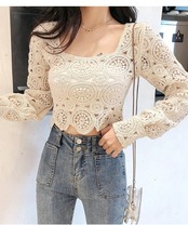 かぎ編み シャツ 長袖 鎖骨見せ ショート丈 背中見せ セクシー オシャレ 重ね着 シンプル へそ出し スクエアネック 長袖 トップス プルオーバー 春 秋 スリム 女性 レディース