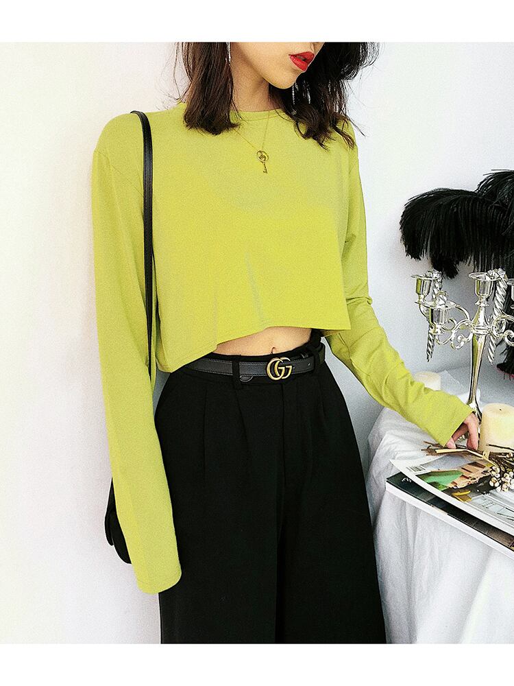 ショート丈 シャツ へそ出し カットソー ラウンドネック 薄手 長袖 無地 シンプル クール ダンス ネオンカラー セクシー 春 秋 袖長め トップス 女性 レディース