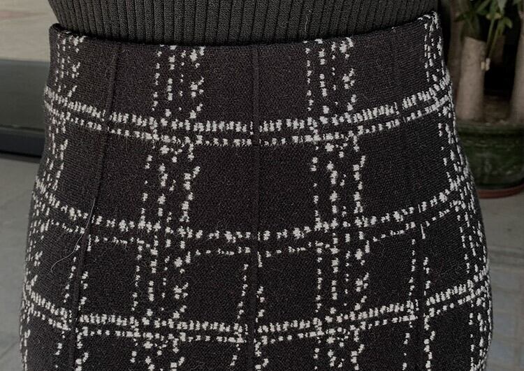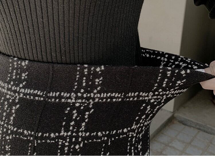 ニットスカート 格子柄 Aライン ウエストゴム ロング ミディアム丈 スリム 裾フリンジ シンプル オシャレ ストレッチ 伸縮性 秋 冬 ボトムス 女性 レディース