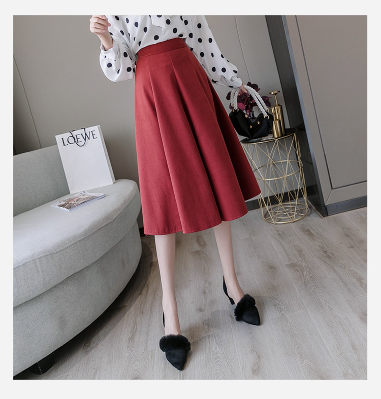 ●ふんわりとしたミディアム丈のフレアスカートです。ウエストはゴムになっており楽ちん!お出かけからオフィスまで、活用性◎のアイテムです。