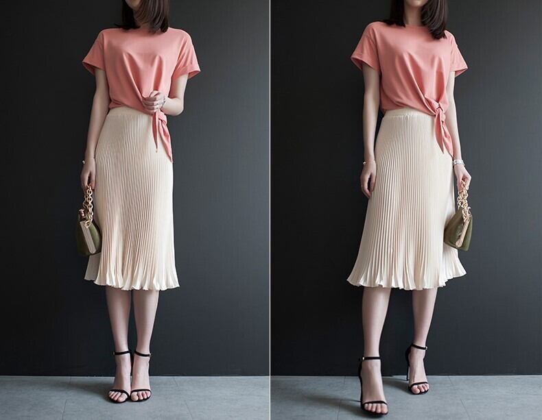プリーツスカート ミディアム丈 Aライン 膝丈 シンプル 無地 メタリックカラー 光沢 サテン地 ウエストゴム お出かけ デート オフィス 春 夏 秋 大人 スタイリッシュ 裾ドレープ ボトムス 女性 レディース