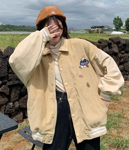 アウター スタジャン ロゴ ミディアム丈 アプリコット ネイビー オレンジバイカラー 大きいサイズ 綿 秋冬 キャラクター くま 長袖 10代 20代 30代 お出かけ デート クール トレンド 大人女子 カジュアル 暖かい