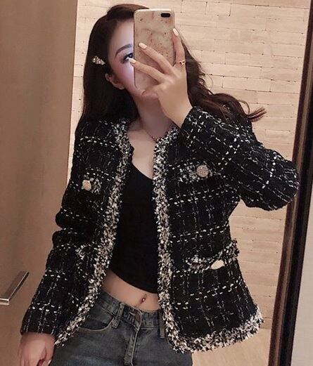 アウター ノーカラージャケット ショート丈 黒 ラウンドネック 大きいサイズ 秋冬 チェック柄 長袖 10代 20代 30代 お出かけ デート 通勤 OL 仕事 オフィス 入学式 お呼ばれ ボタン ポケット 上品 トレンド 大人女子 フォーマル