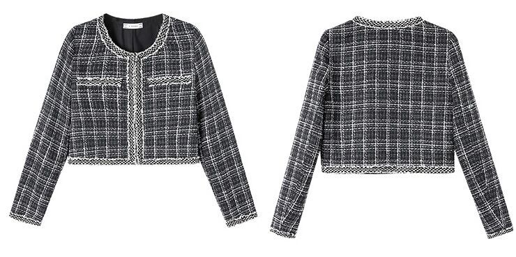 アウターノーカラージャケット ショート丈 黒 ラウンドネック 大きいサイズ 春秋 チェック柄 長袖 10代 20代 30代 お出かけ デート 通勤 OL 仕事 オフィス お呼ばれ トレンド 大人女子 可愛い 上品 カジュアル フォーマル